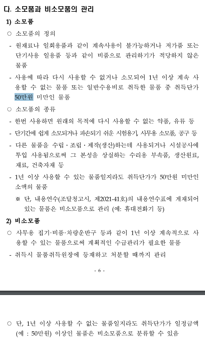 - 사용에 따라 다시 사용할 수 없거나 소모되어 1년 이상 계속사용할 수 없는 물품 또는 일반수용비로 취득한 물품 중 취득단가50만원 미만인 물품