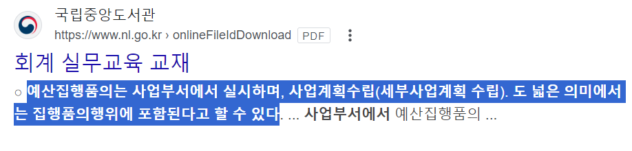 예산집행품의는 사업부서에서 실시하며, 사업계획수립(세부사업계획 수립). 도 넓은 의미에서는 집행품의행위에 포함된다고 할 수 있다.
