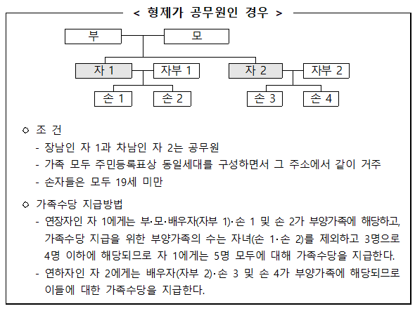 2)주민등록표상 동일 세대내의 부양가족에 대하여 부양하는 공무원(국가공무원 및 인건비가 국고 또는 지방비에서 지급되거나 보조되는 기관에서 근무하는 경우 등 포함)이 2명 이상인 경우