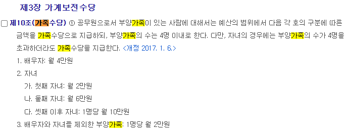 -2007년 영 개정으로 미성년 자녀의 경우에는 출생 시기에 관계없이 부양가족 수 4명의 제한을 받지 않으므로, 셋째 자녀에 대한 가족수당 월 110,000원 추가 지급