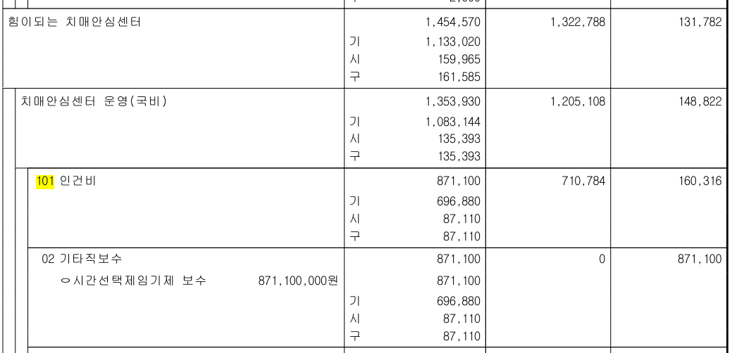 마침 치매안심센터에는 "시간선택임기제 공무원" 이 방문간호를 위해 근무를 하고 있다. 예산서를 확인해보니.. 예산서를 살펴보니 다음과 같이 101-02에 예산수립된 것을 확일 할 수 있다.