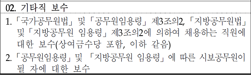 세출예산 성질별 분류(목그룹 ᆞ 편성목 ᆞ 통계목)에 따르면 인건비 중 101-02에 대한 정의가 다음과 같다.