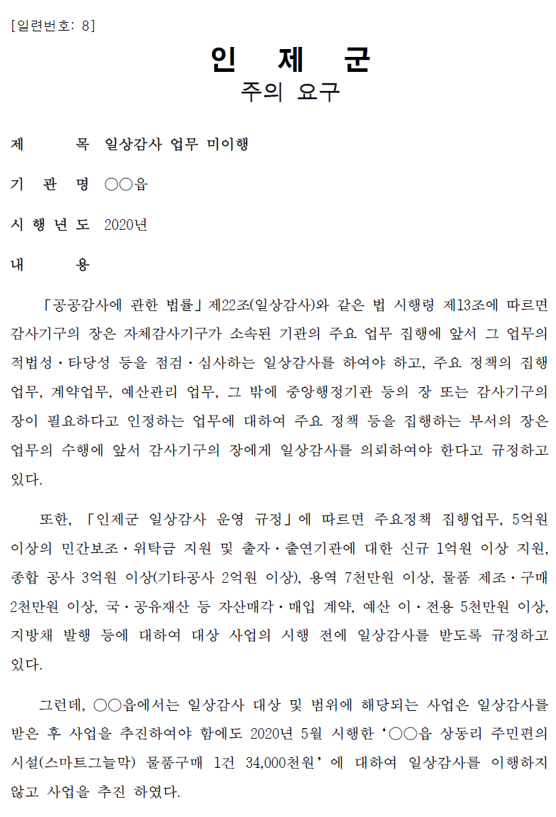 아래는 일상감사에 미이행으로 지적된 사례이며 공개된 파일이다.