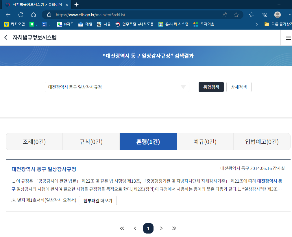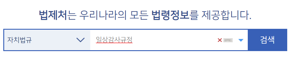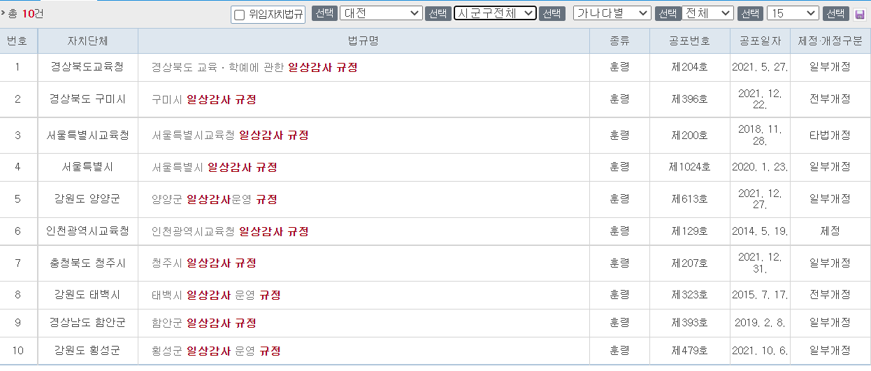 4. 아래는 일부 지자체의 일상감사 규정을 첨부하였다. 지자체별로 대동소이하나 법제처에서 본인이 소속한 지자체의 일상감사 규정을 확인해 보도록 하자. 자치법규 시스템이나 법제처에서 "일상감사 조례" 또는 "일상감사 규정" 으로 검색하면 쉽게 검색이 가능하다.