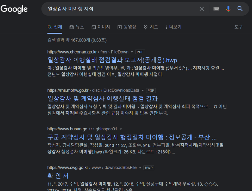 6. 아래는 일부 무작위로 일상감사 미이행으로 감사 지적된 공개 결과 자료는 구글에서 '일상감사 미이행 지정' 으로 검색하면 해당 파일을 쉽게 열람 가능하다. 지적되는 사례가 있으니 일상감사를 감사부서에 의뢰하는 공문을 보내도록 하자.