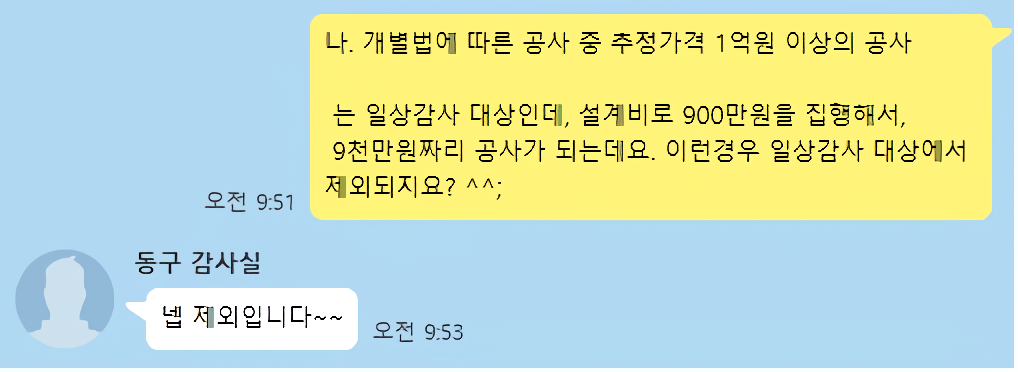 개별법에 따른 공사 중 추정가격 1억원 이상의 공사라 하면, 만약 1억원의 사업비를 확보해서 추진되는 공사 중, 설계비로 일부를 집행해서 공사 비용이 1억원 미만이 된다면 일상감사 대상일까? 일상감사를 하지 않아도 되는 대상이다.
