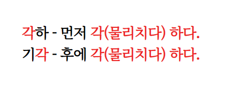 물리칠 각(却)이 앞에 오면 앞서 물리치는 것이고, 각이라는 단어가 뒤에오면 내용을 검토한 뒤에 각하는 것이다.