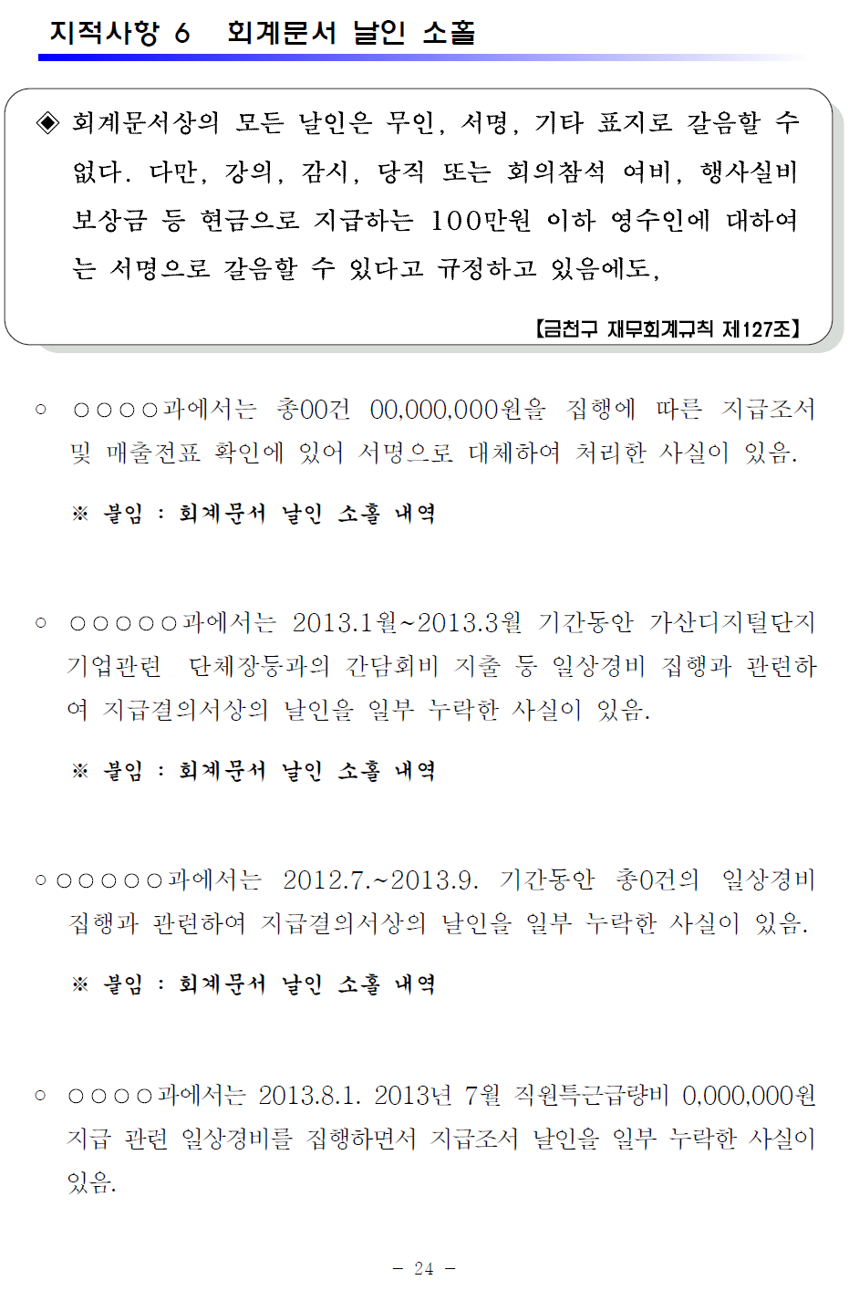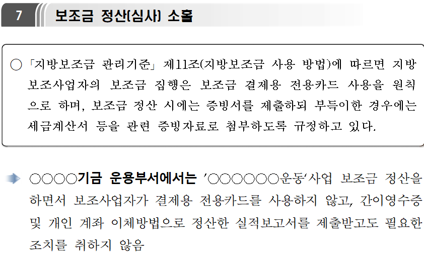 | 관련글 : 시책업무추진비 지적 사례 모음 부서운영업무추진비 집행 지적 감사 사례 급량비 자주 지적되는 사항 급량비 지급관련 규정 행사실비 지원금으로 식대 지급이 가능한지? 관외출장 식대 지급 관련 연찬 강사수당 지급 기준 및 근거 연찬 지자체 감사지적 결과 모음 PDF 자치단체감사 반복지적사례 일상감사 연찬 |