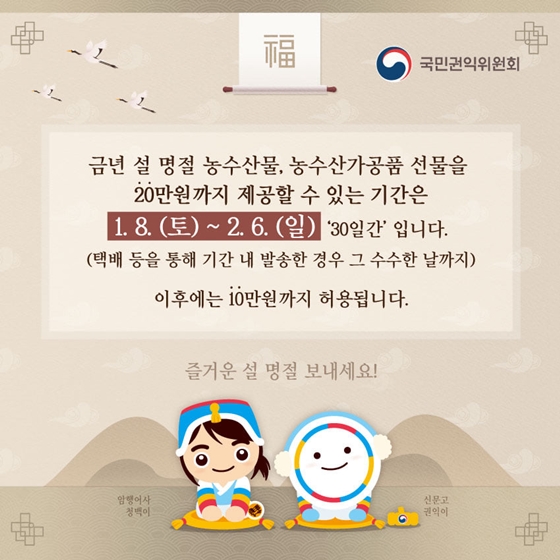 금년 설 명절 농수산물, 농수산가공품 선물을 20만원까지 제공할 수 있는 기간은 1.8(토)~2.6(일) ‘30일간’입니다. (택배 등을 통해 기간 내 발송한 경우 그 수수한 날까지)