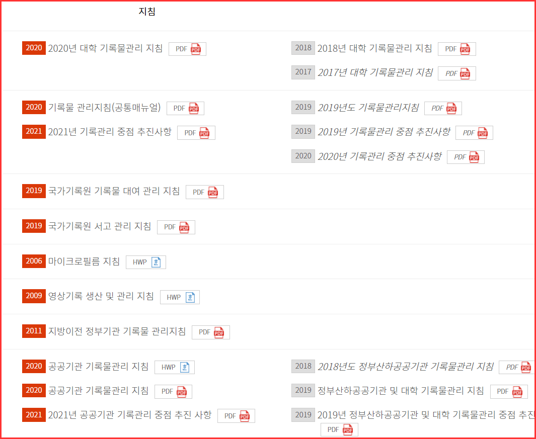 역시 국가기록원 다운 검색결과다. 국가기록원에서 지침을 검색하면, 해당 가이드라인을 다운받을 수 있게 페이지를 구성되어 있다.