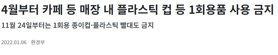 코로나19 등의 이유로 한시적으로 허용됐던 카페 등 식품접객업 매장 내 플라스틱 컵 등 1회용품 사용이 2022년 4월 1일부터 다시 금지된다. 2022년 11월 24일부터는 1회용 종이컵과 플라스틱으로 만들어진 빨대나 젓는 막대도 사용할 수 없다