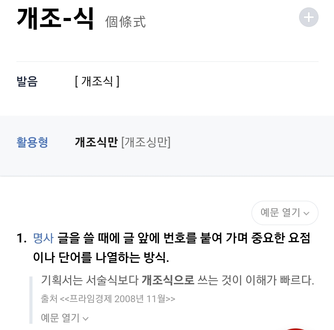 개조식은 서술식(완전한 문장)과 반대되는 문장기술 방식