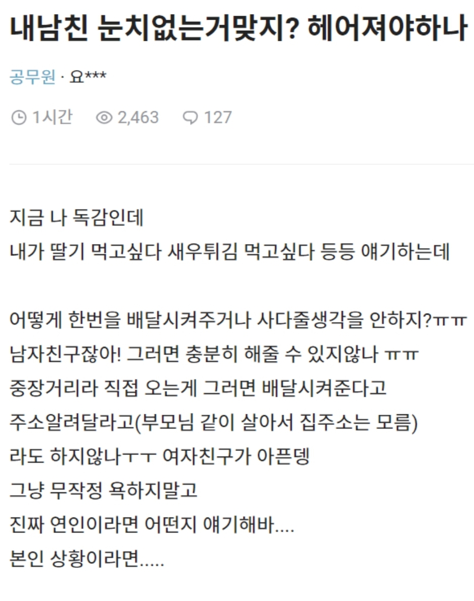여자가 아프다는 핑계로 남자를 길들일려고 하는거고, 평소에 뭐 사달라고 눈치 많이 주는 타입이라 남자는 기분나쁘니 모르는척 하는중. 여친이 아프면 들어줄법만도 한데 안 들어주는걸 보면 남자도 손절각 보고 있는 상태라고 할 수 있음