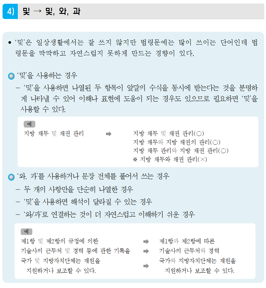 위 문장을 풀이하자면 100세제곱미터 안에 사무실공간 및 휴게실을 확보해야 한다. 라고 명시된 것에서는 '와'라는 의미로 이해가 된다. 즉 사무실공간과 휴게실을 확보해야 한다고 명시하면 보다 이해가 쉽다고 할 것이다. 하지만 많은 행정가들과 공무원들은 '및'이라는 단어에 중독되어 있다고 봐야할 것이다. 우리가 흔히 일상 대화에서 사용하는 문장이 아닌 경우 좀 더 문서가 정형화되는 것 같은 느낌이 들기 때문에 '와(과)'를 쓰는 것을 지극히 피하려고 한다. 이는 습관처럼 수십년간 사용하고 법이나 규정 등에서 익숙해졌기 때문에 '및' 이라고 쓰려고 애를 쓰는 것이다. 소위 중독된 것이다.
