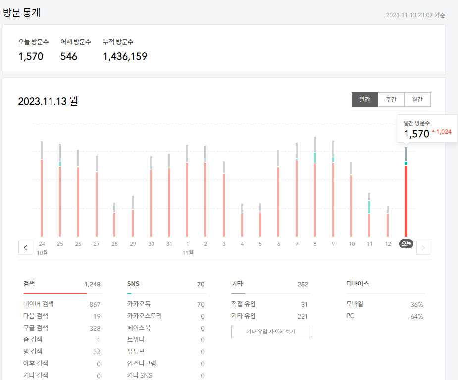 한달에 수익은 2만원~1만원 정도이며, 이정도의 수익은 아래 만큼의 방문자가 있다. 내글은 대체로 업무 지침이나 법적 근거를 나열해서 그런지, 업무시간에 조회하는 글들이 많다. 주말에는 조회수가 많지 않다.