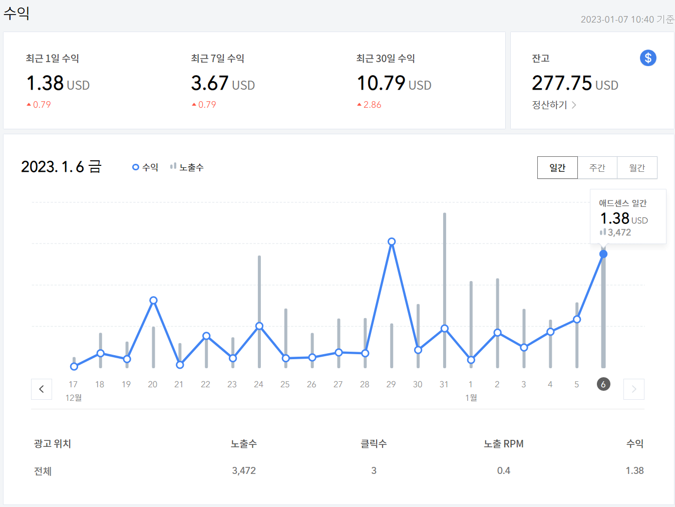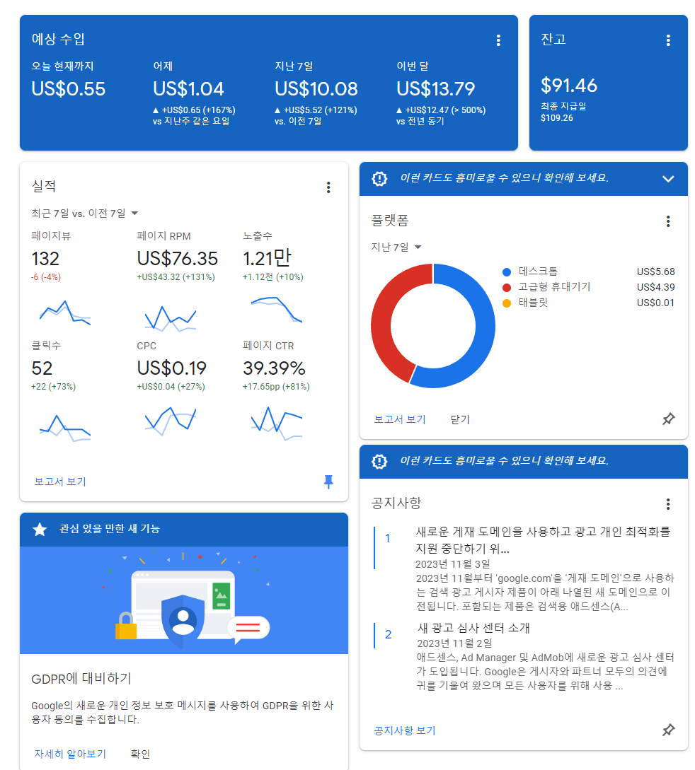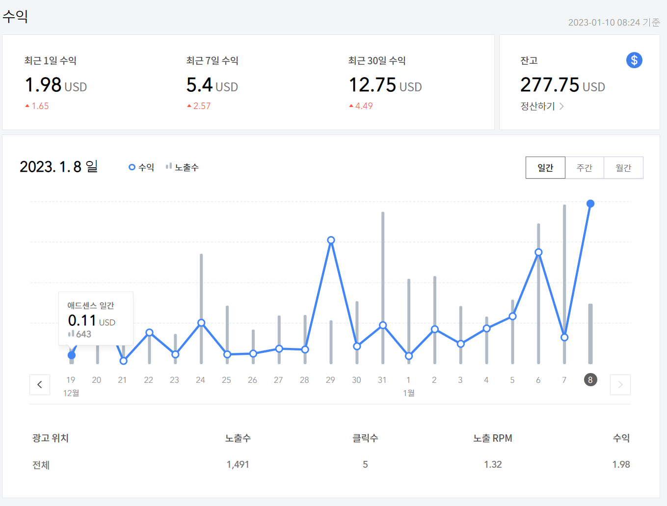 수익이 대단하지는 않지만, 조금씩 들어오는 수익을 보자면 티스토리를 한 지는 약 3년정도 되어간다. 누군가에게는 도움이 되는 글을, 나에게는 소장할 만한 기록을 그게 나중에 도움이 될만한 지침이 될만한 기록을 노트처럼 기록해봤다. 큰 수익은 아니고 이걸로 경제적으로 도움이 크게 되지는 않지만, 가끔 소소하게 지인들에게 커피한 잔 사줄 정도는 되는 것 같다. 한달 수익은 10달러 겨우 1만원 조금 넘는 돈이지만 소소한 수익이 재미있다. 그저 나의 글들이 도움이 되었다고 생각을 하며 만족을 하고 있다.