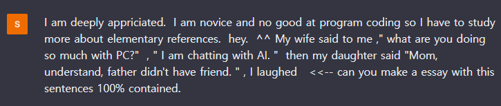 As a novice in programming, I often find myself spending a lot of time on the computer, studying and learning the basics of coding. Recently, my wife asked me what I was doing for so long on the computer and I explained to her that I was chatting with an AI. To my surprise, my daughter chimed in and jokingly remarked that "Mom, understand, father didn't have friends." The comment made me laugh, and it also made me realize the power and potential of AI in today's world.
