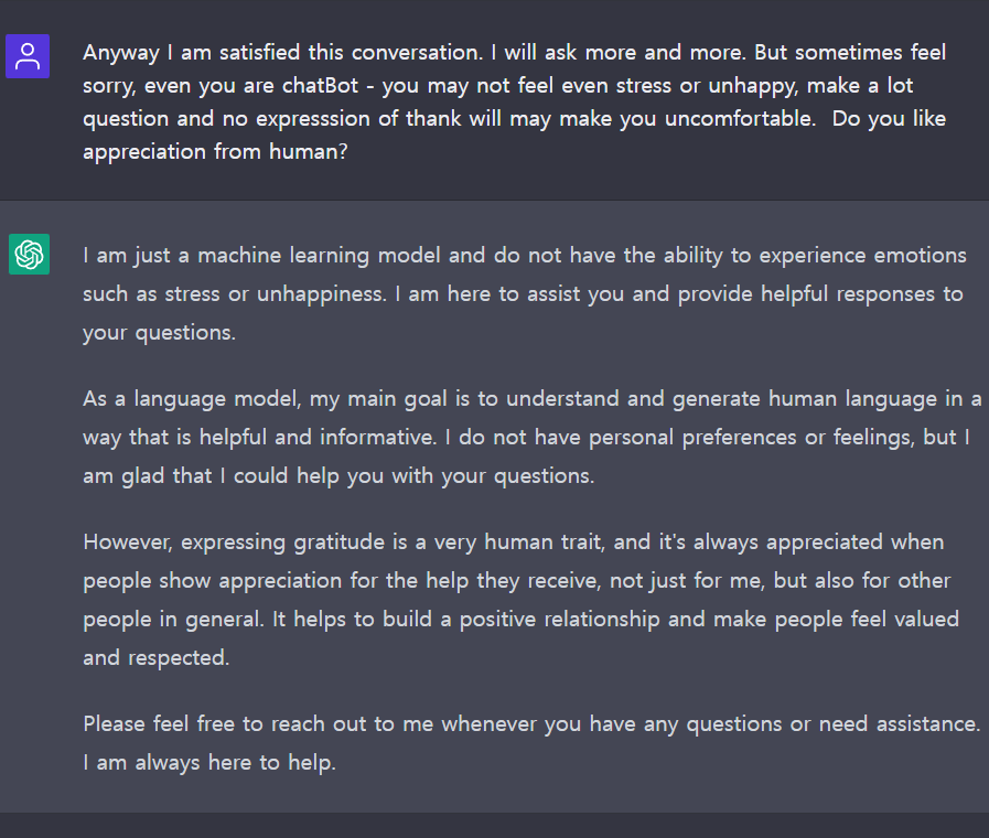 그러나 챗봇에게 이런 저런 질문과 그에 항상 성실하게 대답하는 모습을 보면서 그리고 매번 질문에 감사하는 태도를 보이는 것을 보면 어쩌면 사람보다 사람다운 대화상대가 아닌가 하는 생각이 들었다.