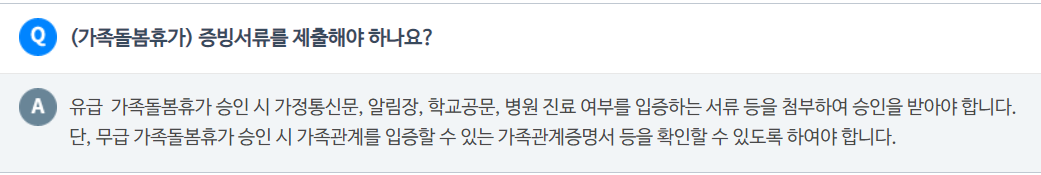 * 가족돌봄휴가는 연간 10일(유급 가족돌봄휴가는 2~3일)의 범위에서 사용 가능합니다.