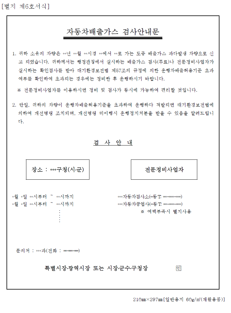 ③ 신고된 자동차 소유자에게는 제3조에 의한 관할행정기관에서 실시하는 무료검사 등을 받을 수 있도록 별지 제6호서식(배출가스) 또는 별지 제7호서식(소음)의 안내문을 송부하여야 한다.