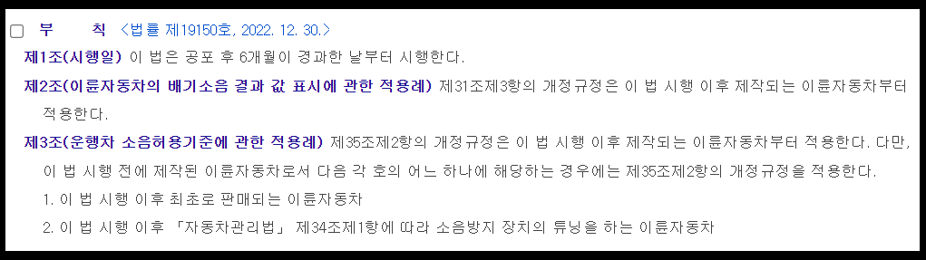 그러나 이것을 홍보하면서 누락하는 내용이 있는데, 그것은 바로 2023년 7월 1일 이후 생산된 오토바이에만 적용이 된다는 것이다. 공포 후 6개월이 경과한 날, 즉, 2023년 7월 1일부터 시행되는 이 사항은, 제35조제2항의 개정규정은 이법 시행 이후 제작, 판매, 튜닝되는 이륜자동차부터 적용된다.