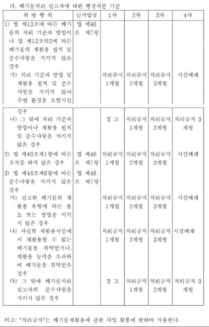 ④ 제1항에 따라 휴업 또는 폐업의 신고를 하려는 자(폐기물처리업자와 폐기물처리 신고자로 한정한다)는 환경부령으로 정하는 바에 따라 보관하는 폐기물을 전부 처리하여야 한다.<신설 2010. 7. 23., 2015. 1. 20., 2017. 4. 18.>