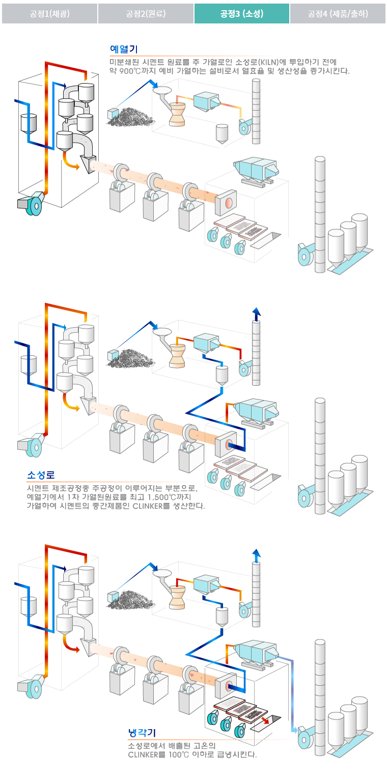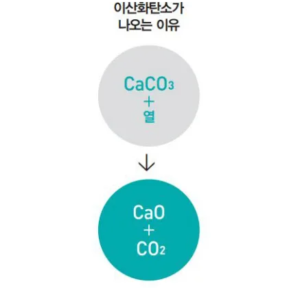 시멘트 1t을 만들려면 1t 가까운 이산화탄소가 나온다. 어쩔 수 없는 태생적 한계가 있다. 시멘트 제조 공정을 보면, 석회석(CaCO₃)을 1400도 이상으로 가열된 소성로에서 구우면 산화칼슘(CaO) 덩어리가 된다. 화학식에서 알 수 있듯이 이 과정에서 이산화탄소가 나온다. 산화칼슘에 점토와 규산(알루미늄), 철 등과 혼합해 중간재인 클링커를 만든다. 클링커가 식으면 이를 분쇄해 약 5% 정도의 석고와 섞어 만든 게 시멘트다. 시멘트 생산 과정에서 배출되는 이산화탄소의 발생 과정을 좀더 세분화해서 보면 절반 이상은 산화칼슘으로 변하는 화학반응에서, 약 40%는 시멘트 소성로에서 화석연료(유연탄) 연소로 발생한다. 채석, 운송, 분쇄, 냉각, 혼합 등 기타 공정에서 발생하는 이산화탄소의 비율은 10% 이하다.