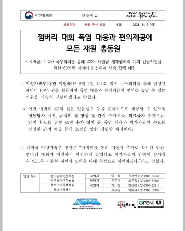 이런 상황에 잼버리에 아이들을 보낸 외국의 학부모들은 한국이 이런 나라였냐며 분통을 터뜨렸다. 논란이 커지자 외교부는 이례적으로 23개 공관을 상대로 현장 상황을 알리는 긴급 브리핑을 실시했다.
