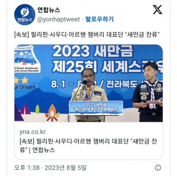 이에 따라 5일 9시에 열리는 각국 대표단 회의서 중단 결정이 내려질 수 있는 상황에서, 필리핀, 사우디, 아르헨 잼버리 대표단 3개국만 잔류하기로 하고 나머지 20개 국가들은 중단하고 복귀를 했다. 23개국 중 3개국만 남았으나 세계적 대회가 4개국 대회로 줄어든 셈이다.