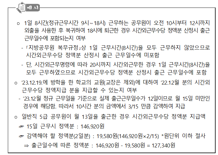 | ◦ 1일 8시간(정규근무시간 9시~18시) 근무하는 공무원이 오전 10시부터 12시까지 외출을 사용한 후 복귀하여 18시에 퇴근한 경우 시간외근무수당 정액분 산정시 출근 근무일수에 포함되는지 여부 -「지방공무원 복무규정」상 1일 근무시간(8시간)을 모두 근무하지 않았으므로 시간외근무수당 정액분 산정시 출근 근무일수에 미포함 -단, 시간외근무명령에 따라 20시까지 시간외근무한 경우 1일 근무시간(8시간)을 모두 근무하였으므로 시간외근무수당 정액분 산정시 출근 근무일수에 포함 ◦ ’23.12.19.에 방학을 한 학교의 교원(교장은 제외)에 대하여 ’22.12월 분의 시간외근무수당 정액지급 분을 지급할 수 있는지 여부 -’23.12월 정규 근무일을 기준으로 실제 출근근무일수가 12일이므로 월 15일 미만인 경우에 해당함. 따라서 10시간 분의 금액에서 3/15 만큼 감액하여 지급 ◦ 일반직 5급 공무원이 월 13일을 출근한 경우 시간외근무수당 정액분 지급액 ☞ 15일 근무시 정액분 : 146,920원 ☞ 감액해야 할 정액분(2일분) : 19,580원(146,920원×2/15) *원단위 이하 절사 ⇒ 출근일수에 따른 정액분 : 146,920원-19,580원=127,340원  |
