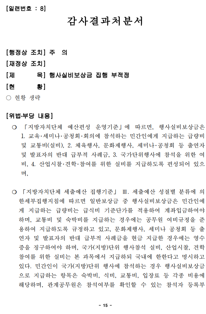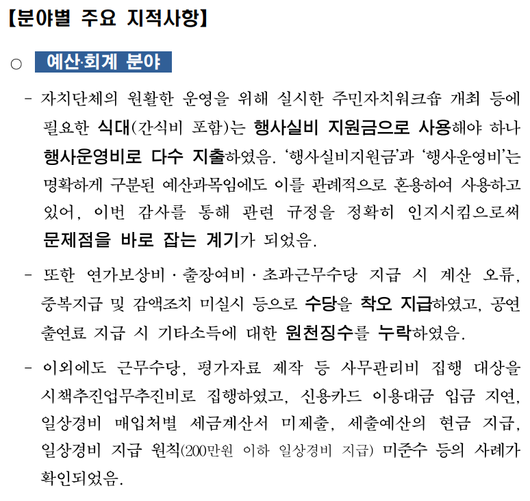 - 자치단체의 원활한 운영을 위해 실시한 주민자치워크숍 개최 등에필요한 식대(간식비 포함)는 행사실비 지원금으로 사용해야 하나행사운영비로 다수 지출하였음. ‘행사실비지원금’과 ‘행사운영비’는명확하게 구분된 예산과목임에도 이를 관례적으로 혼용하여 사용하고있어, 이번 감사를 통해 관련 규정을 정확히 인지시킴으로써문제점을 바로 잡는 계기가 되었음.