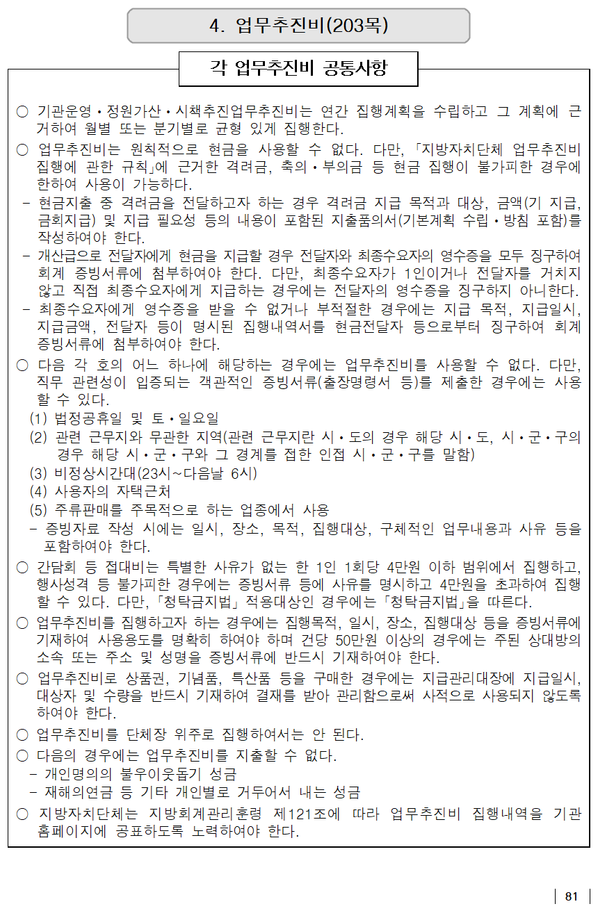 ○ 업무추진비는 원칙적으로 현금을 사용할 수 없다. 다만, 「지방자치단체 업무추진비 집행에 관한 규칙」에 근거한 격려금, 축의ㆍ부의금 등 현금 집행이 불가피한 경우에 한하여 사용이 가능하다.
