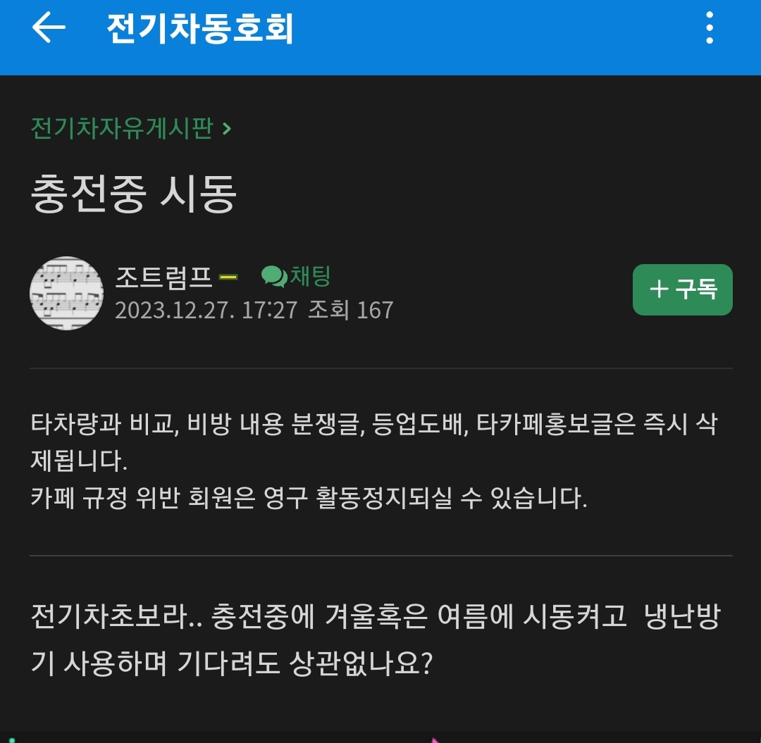 네이버카페 중에 '전기차 동호회'라는 카페가 있었다. 이 카페에서 여러가지 전기차 운영에 대한 정보를 얻을 수가 있었다.