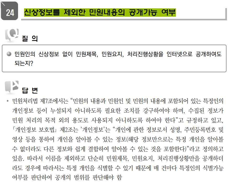 민원처리법 제7조에서는 “민원의 내용과 민원인 및 민원의 내용에 포함되어 있는 특정인의 개인정보 등이 누설되지 아니하도록 필요한 조치를 강구하여야 하며, 수집된 정보가 민원 처리의 목적 외의 용도로 사용되지 아니하도록 하여야 한다”고 규정하고 있고, 「개인정보 보호법」 제2조는 ‘개인정보’는 “개인에 관한 정보로서 성명, 주민등록번호 및 영상 등을 통하여 개인을 알아볼 수 있는 정보(해당 정보만으로는 특정 개인을 알아볼 수 없더라도 다른 정보와 쉽게 결합하여 알아볼 수 있는 것을 포함한다)”라고 정의하고 있음. 따라서 이름을 제외하고 단순히 민원제목, 민원요지, 처리진행상황만을 공개하더 라도 경우에 따라서는 특정 개인을 식별할 수 있기 때문에 매 건마다 특정인의 식별가능 여부를 판단하여 공개의 범위를 판단해야 함