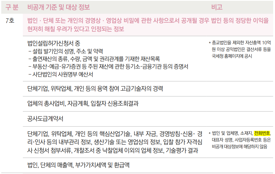 단체 기업 위탁업체, 개인 등, 영업상 비밀에 관한 사항으로 공개될 경우 법인 등의 정당한 이익을 현저히 해칠 우려가 있다고 인정되는 정보.
