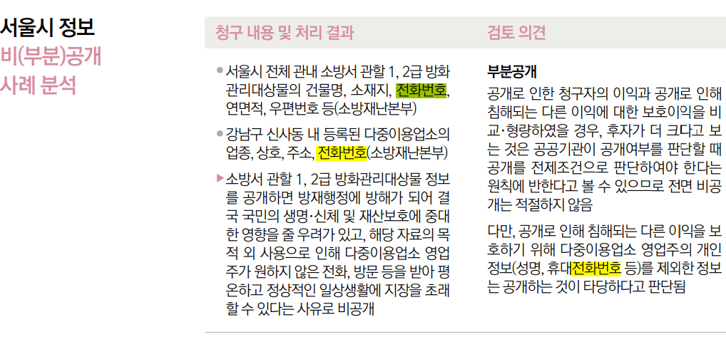 부분공개 공개로 인한 청구자의 이익과 공개로 인해 침해되는 다른 이익에 대한 보호이익을 비 교·형량하였을 경우, 후자가 더 크다고 보 는 것은 공공기관이 공개여부를 판단할 때 공개를 전제조건으로 판단하여야 한다는 원칙에 반한다고 볼 수 있으므로 전면 비공 개는 적절하지 않음 다만, 공개로 인해 침해되는 다른 이익을 보 호하기 위해 다중이용업소 영업주의 개인 정보(성명, 휴대전화번호 등)를 제외한 정보 는 공개하는 것이 타당하다고 판단됨