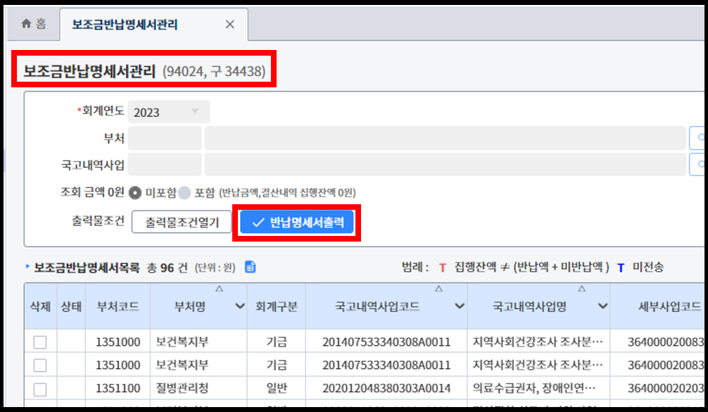 다음은 보탬e "보조금반납명세서관리" 에서 반납명세서출력_
