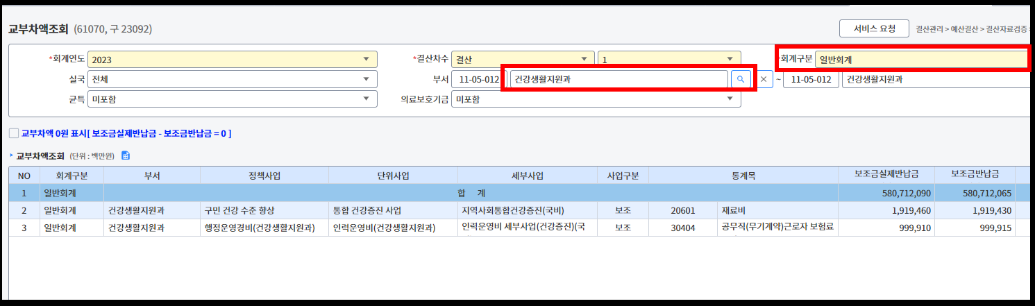 교부차액 조회 화면에서도 해당 목록을 클릭하면, 국비 시도비 등을 확인 할 수가 있다.