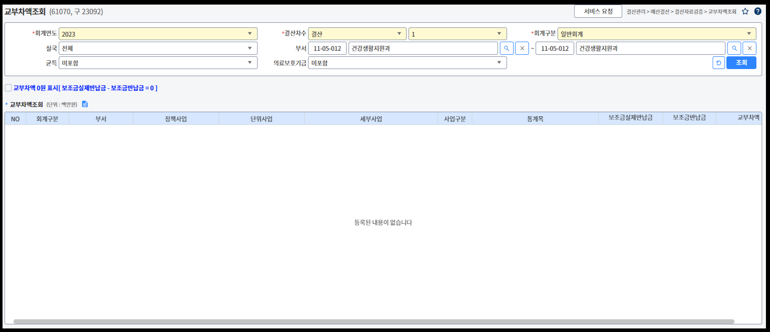 다시 "교부차액조회"화면으로 돌아와서 조회를 누르면, 아무것도 조회되지 않는 화면이 나오는데, 이렇게 나와야 오류가 없다는 것이다.