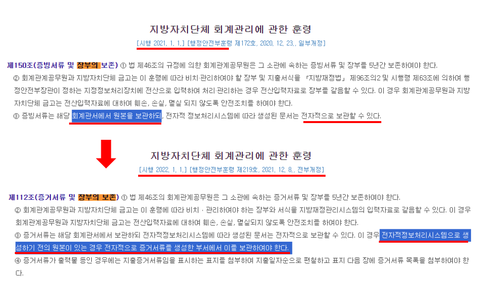 요약: 과거 증빙서류는 회계관서에서 원본을 보관하도록 하고 있었으나, 2022년부터는 원본을 전자적으로 생산한 부서에서 보관하도록 규정하고 있다. (지방자치단체 회계관리에 관한 훈령 제112조 제3항)